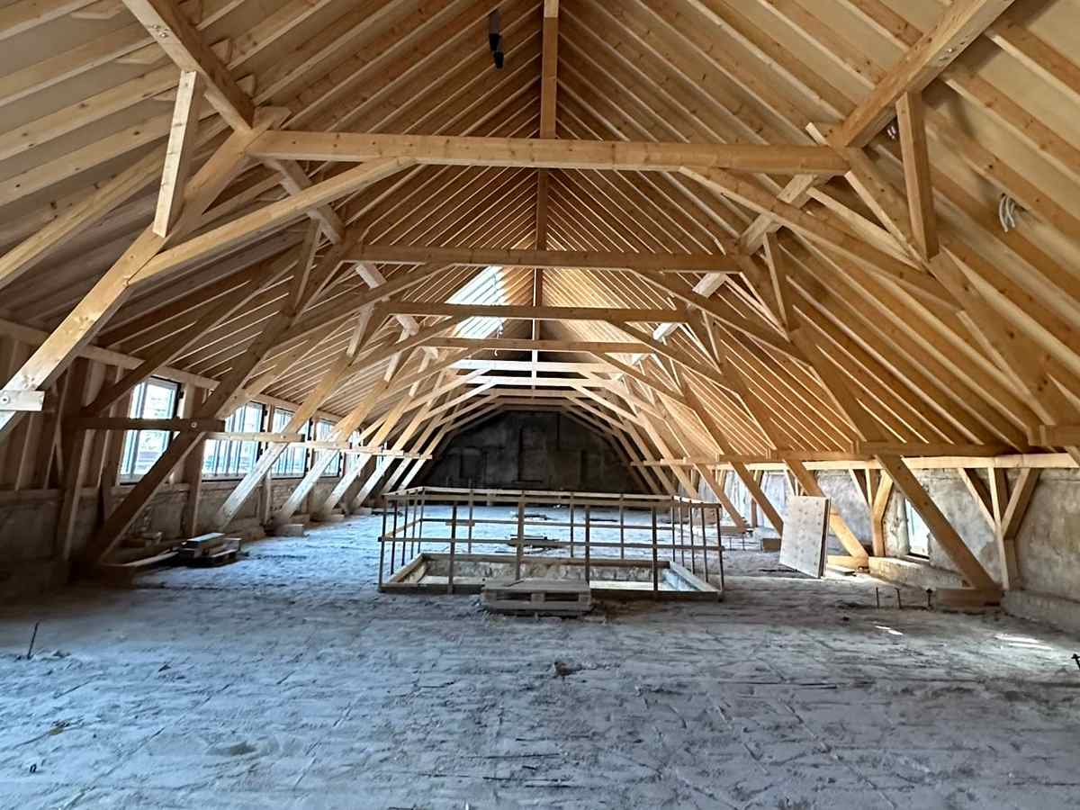 Abdecken des Daches, Rückbau des Dachstuhles und Stellen des neuen Dachstuhles im Juni bis August 2024