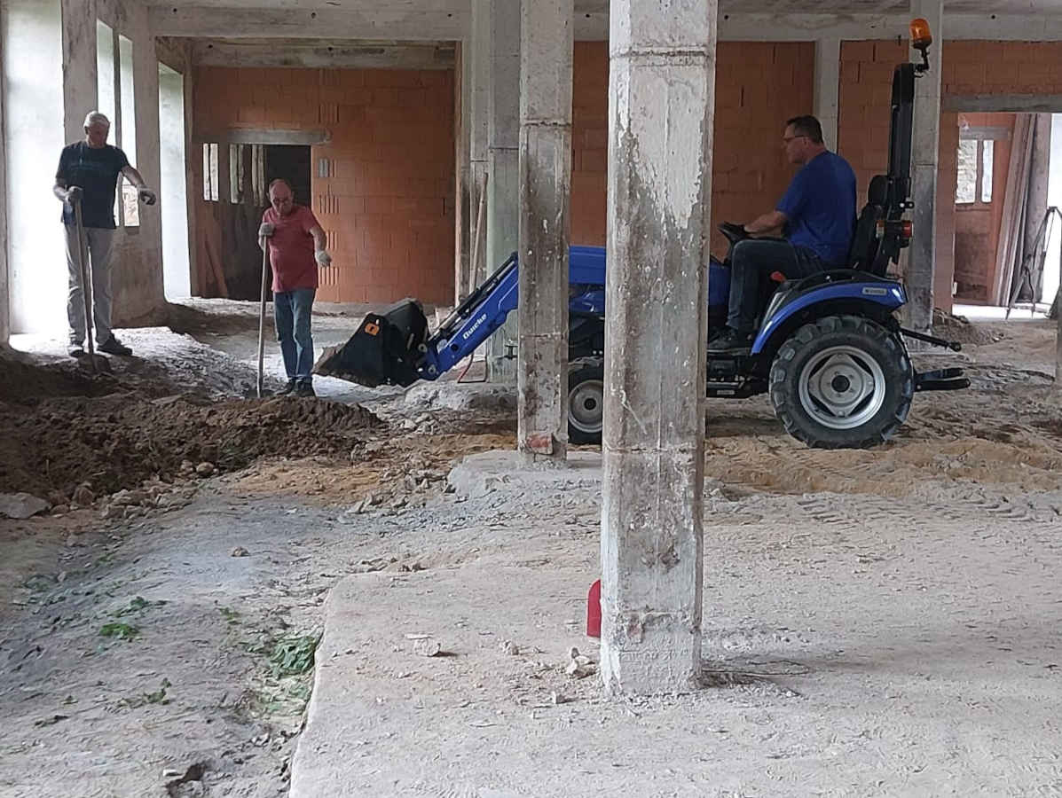 Arbeiten am DGH im April und Mai 2024 - Trockenlegungsarbeiten, Schacht- und Drainarbeiten, erste Betonierarbeiten