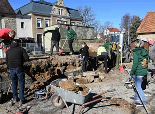 Arbeiten im Innenhof mit Unterstützung im Rahmen des Jägermeister Volunteering Days 2025